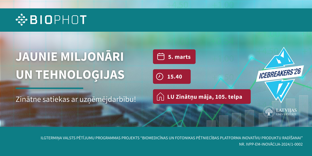 “BioPhoT” Icebreakers’26 satelītpasākums “Jaunie miljonāri un tehnoloģijas” aicina ikvienu interesentu kļūt par daļu no vietas, kur dzimst nākamie veiksmes stāsti – tur, kur zinātne satiekas ar uzņēmējdarbību.